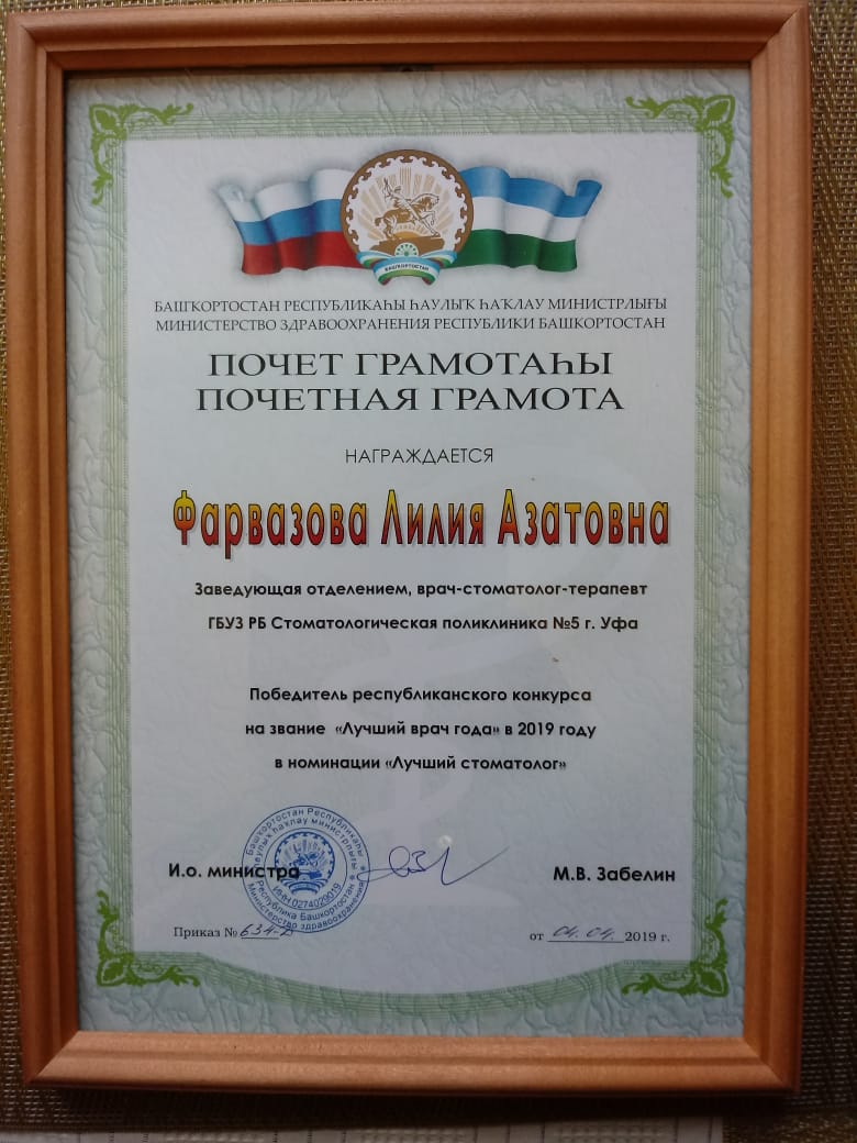 13 июня 2019 года в ГКЗ «Башкортостан» состоялась торжественная церемония награждения победителей Республиканского конкурса «Лучший врач года» за 2019 год. В номинации «Лучший стоматолог» победителем стала заведующая отделением, врач-стоматолог-терапевт ГБУЗ РБ Стоматологическая поликлиника № 5 г. Уфа Фарвазова Лилия Азатовна. Вручение Почетных грамот проводил исполняющий обязанности Министра здравоохранения Максим Васильевич Забелин.