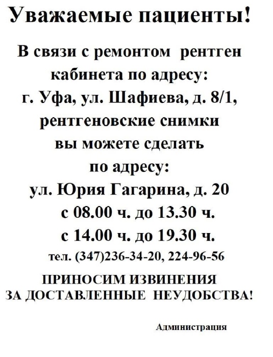 Внимание!В связи с ремонтом рентгеновского кабинета в Подразделении № 1 по ул. Шафиева 8/1